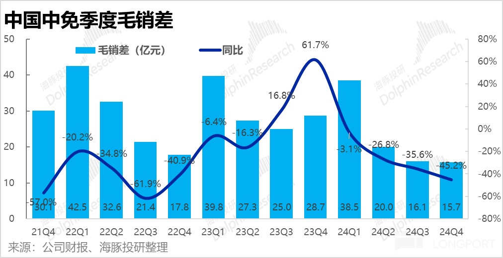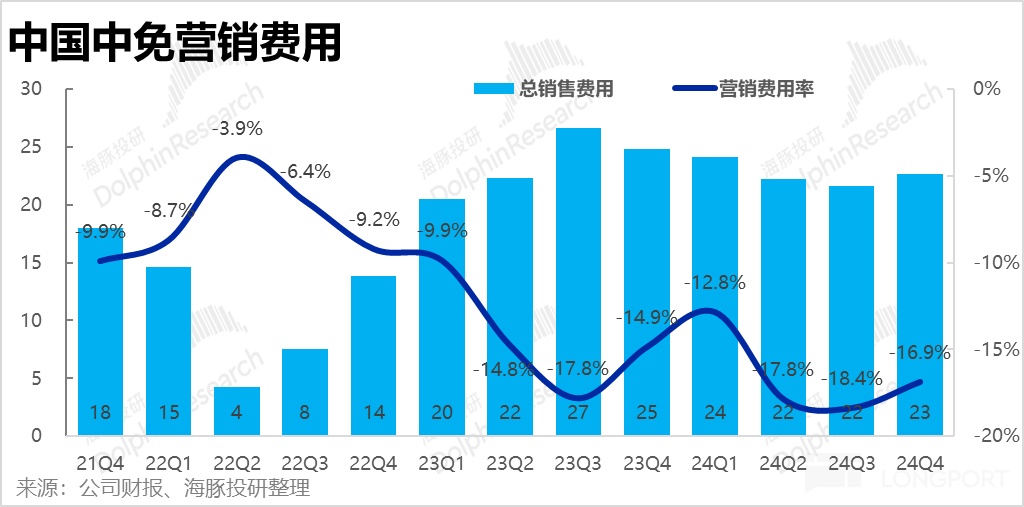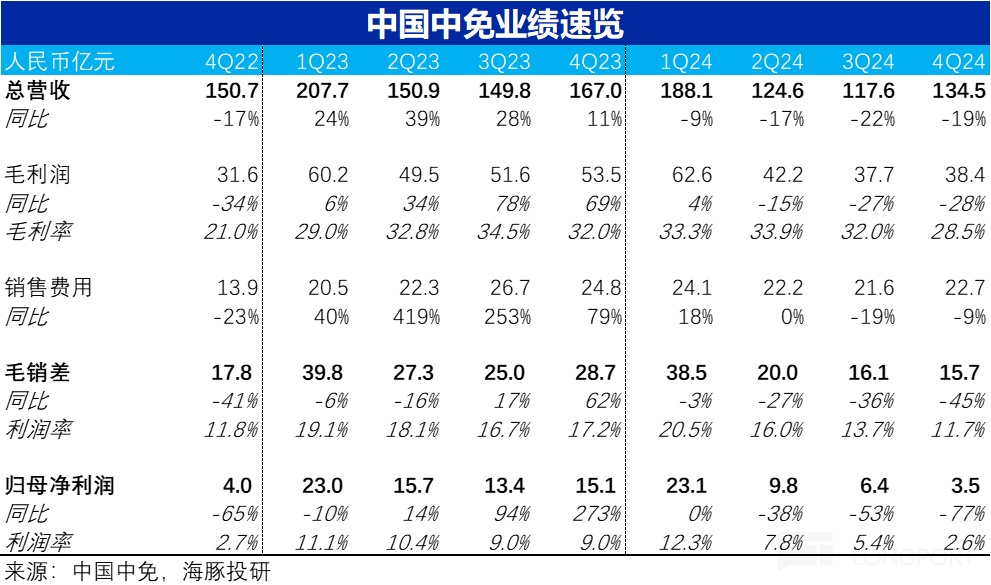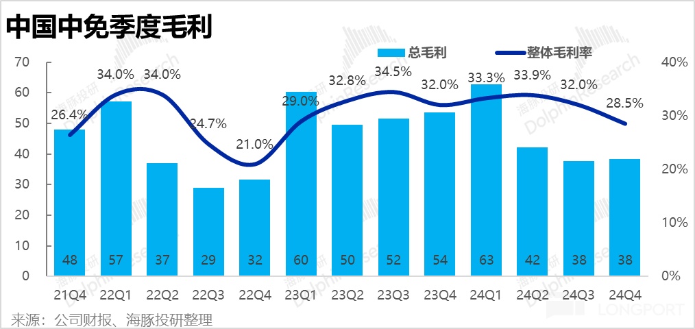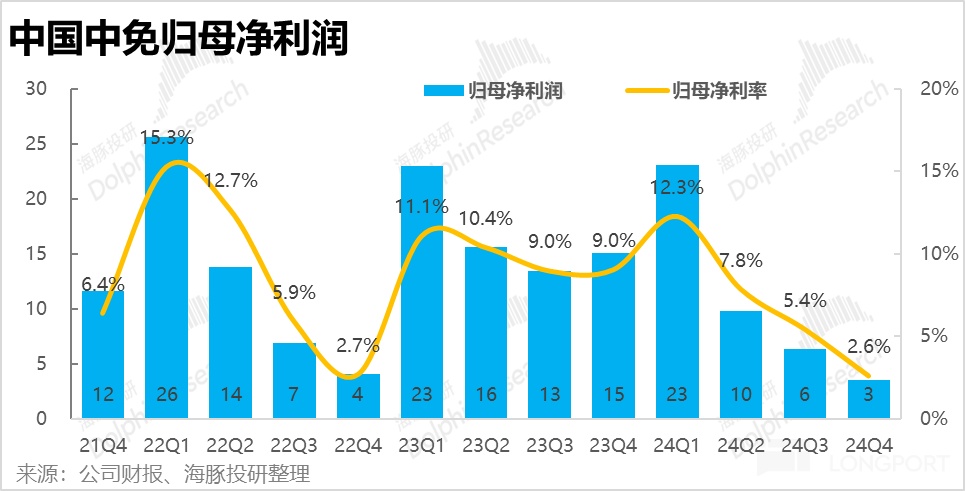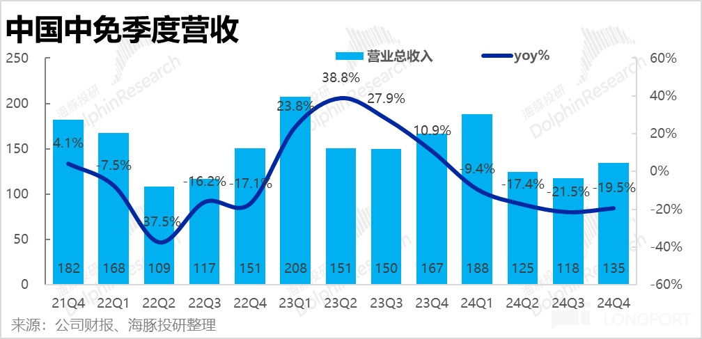 營收層面,中國中免 24 年 4 季度營收 135 億元,同比下滑 19.5%,處於 2Q/3Q 同比跌幅的中間,換言之,沒有呈現出明確的跌幅繼續擴大,或有所縮窄的傾向性。