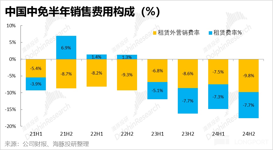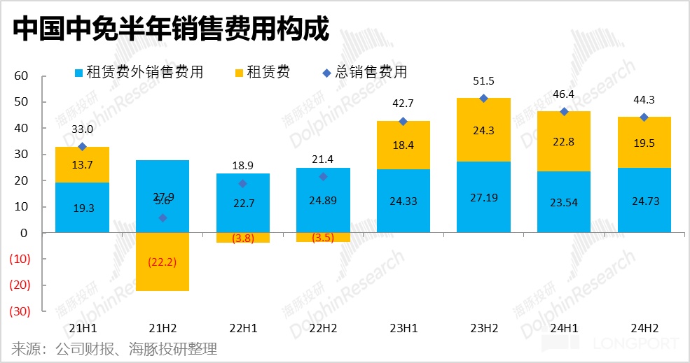按半年度披露的銷售費用構成來看,儘管 2024 年機場渠道的營收是顯著修復了的,但主要支付給機場的租賃費用相比去年卻是略降的,從 94.2 億下降到 90.6 億。體現出中免與機場重新簽訂的給機場更低分成條款帶來的幫助。