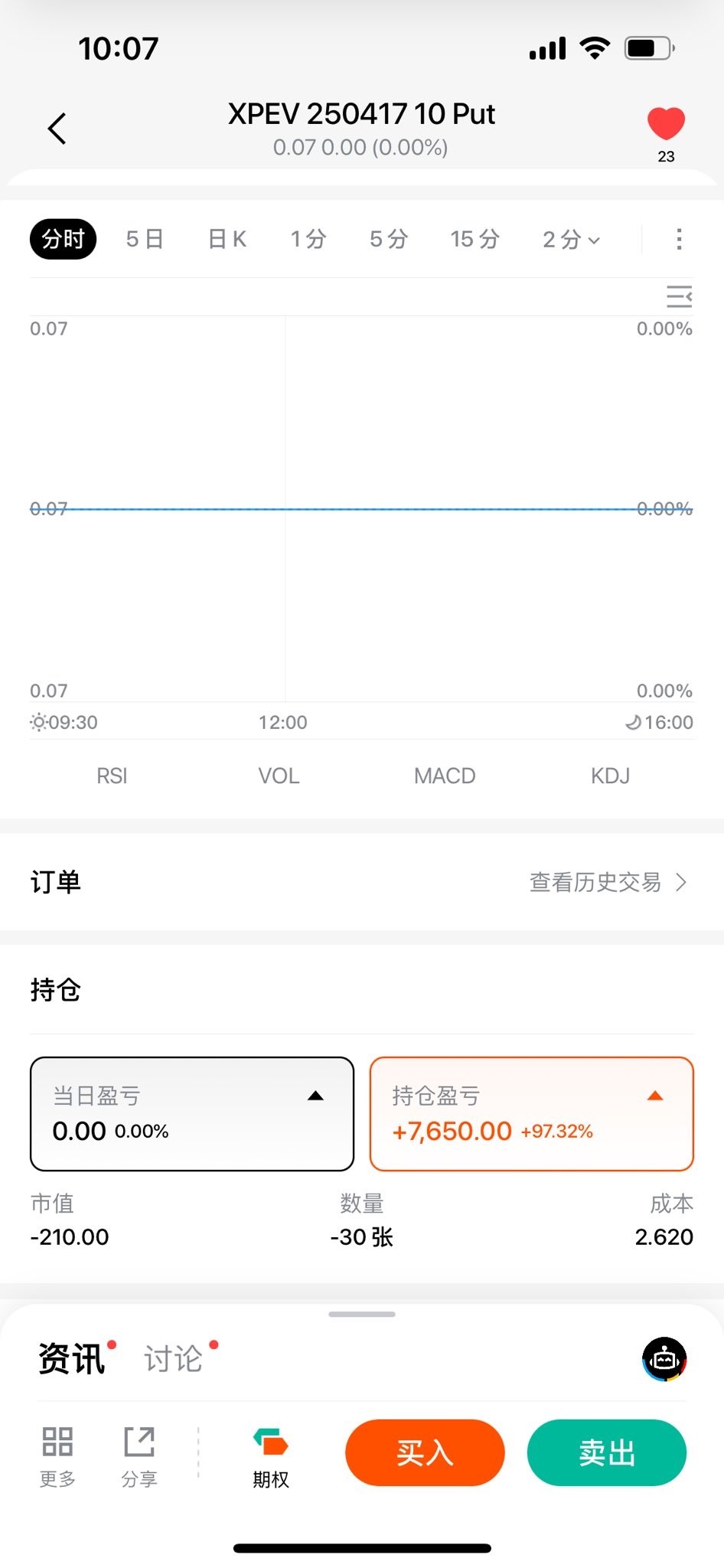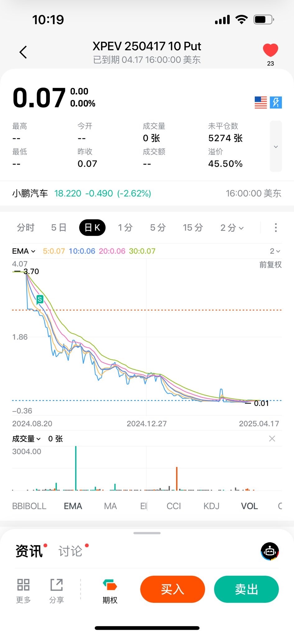 去年 9 月份賣的,當時股價 9 塊左右,賣的 25 年 0417 10 塊的 put,現在小鵬美股 18 左右,根本沒有行權的機會了,安心拿着等它失效,然後你拿到 100% 的收益即可!如果股價跌到 10 塊你還能便宜拿到正股