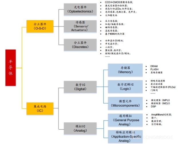 那麼本輪半導體銷售額的上行,主要是哪些芯片帶動的呢?先從半導體的分類入手,熟悉一下半導體的具體分類。半導體主要分為 5 類,分別是數字芯片、模擬芯片、光電器件、傳感器和分立器件。數字芯片和模擬芯片是半導體行業最重要的組成部分。模擬芯片主要用於模擬信號(聲音、光線、温度等),包括有運算放大器、線性穩壓器、電源管理等。而數字芯片主要進行算術和邏輯運算,包括有 CPU、微處理器、存儲器、微控制器等。