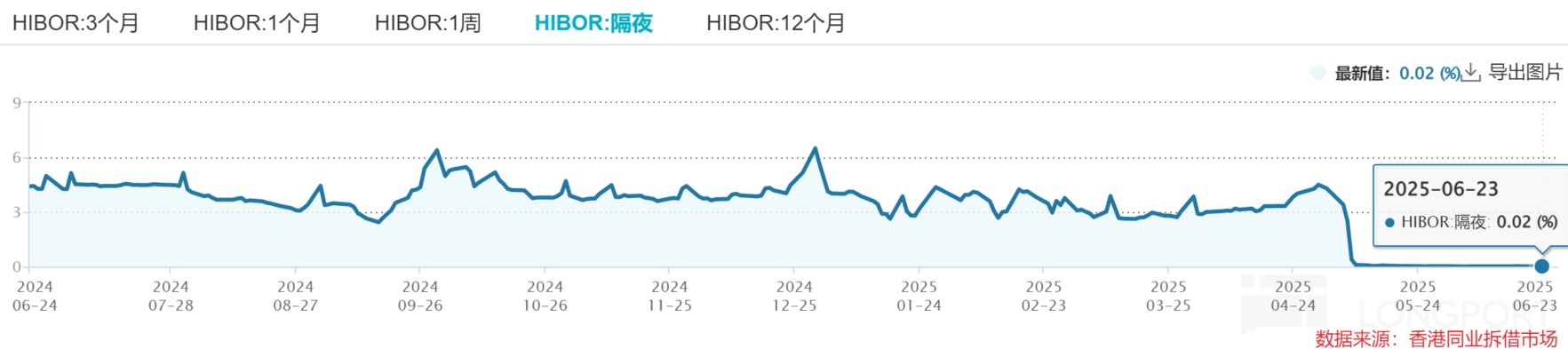 目前的港幣匯率仍然在弱方保證附近 7.85 附近,同時 HIBOR 隔夜利率 0.02%。由於香港是聯繫匯率制度,7.85 附近的匯率是無法進一步貶值的,剩下的只剩下升值一個方向。