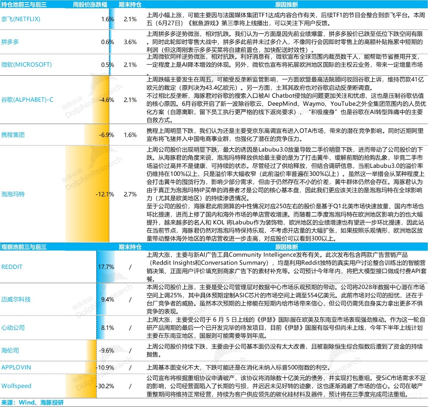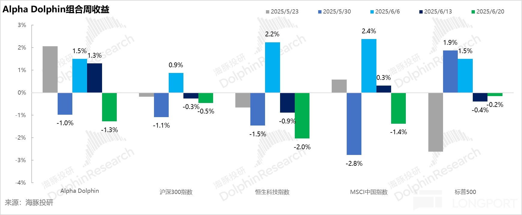 上週海豚投研的虛擬組合 Alpha Dolphin 未調倉,當週下跌-1.3%,跑輸了觀測市場——標普 500(-0.2%)和滬深 300(-0.5%),但跑贏 MSCI 中國(-1.4%)與恒生科技(-2.0%)。