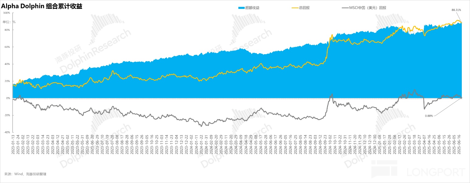 自組合開始測試(2022 年 3 月 25 日)到上週末,組合絕對收益是 88%,與 MSCI 中國相比的超額收益是 87%。從資產淨值角度來看,海豚君初始虛擬資產 1 億美金,截至上週末超過了 1.91 億美金。