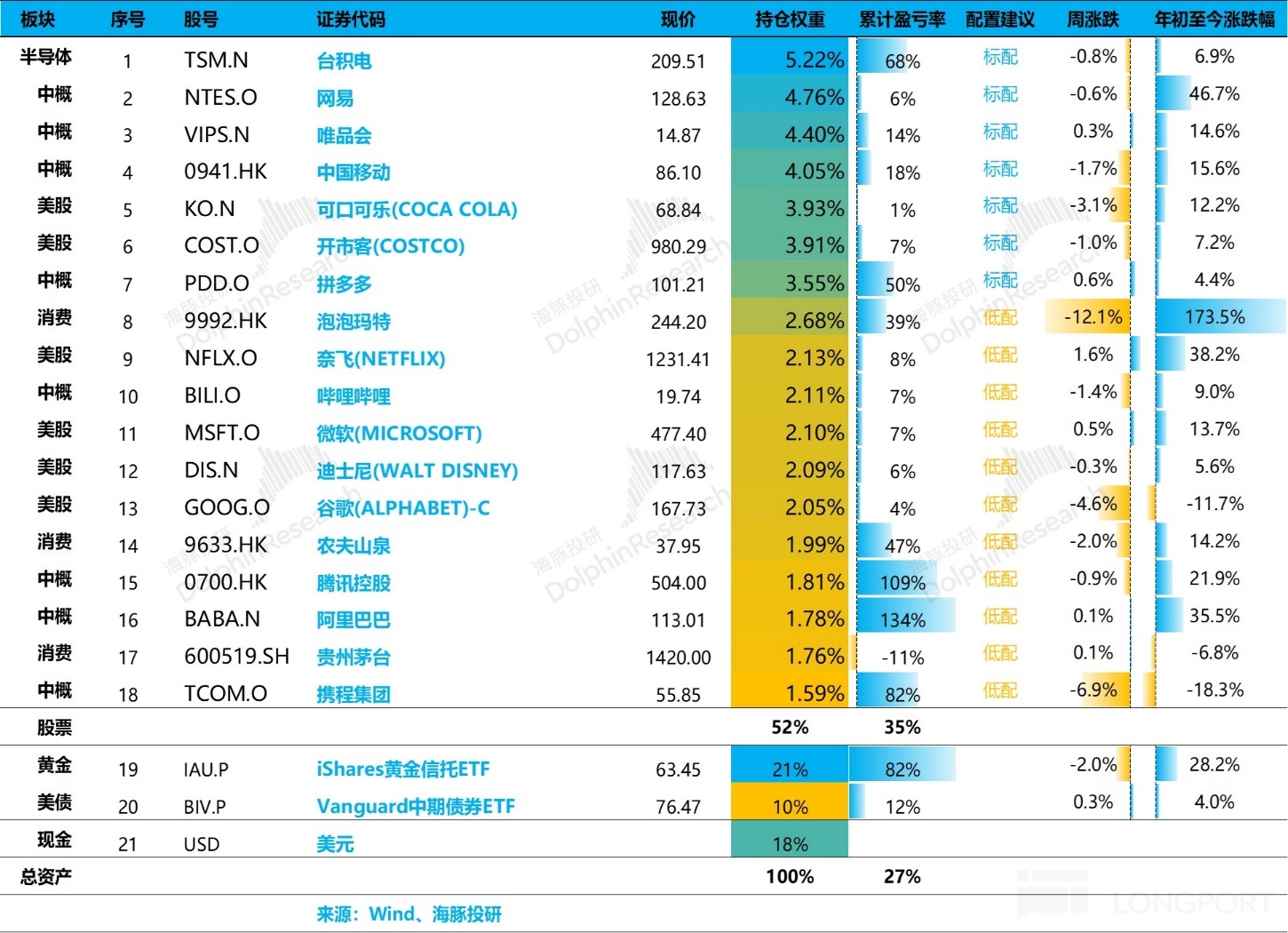 Alpha Dolphin 虛擬組合共計持倉 18 只個股與權益型 ETF,其中標配 7 只,其餘低配。股權之外資產主要分佈在了黃金、美債和美元現金上,目前權益資產與黃金/美債/現金等防守資產之間大約 52:48。