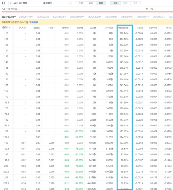 很多人第一反應是:同一個標的,IV 不就該一樣嗎?但打開期權鏈你就會發現,不同行權價的 IV 差別很大,不同到期日的 IV 也完全不同。這就是我們常説的 “波動率微笑” 或 “波動率偏斜”。