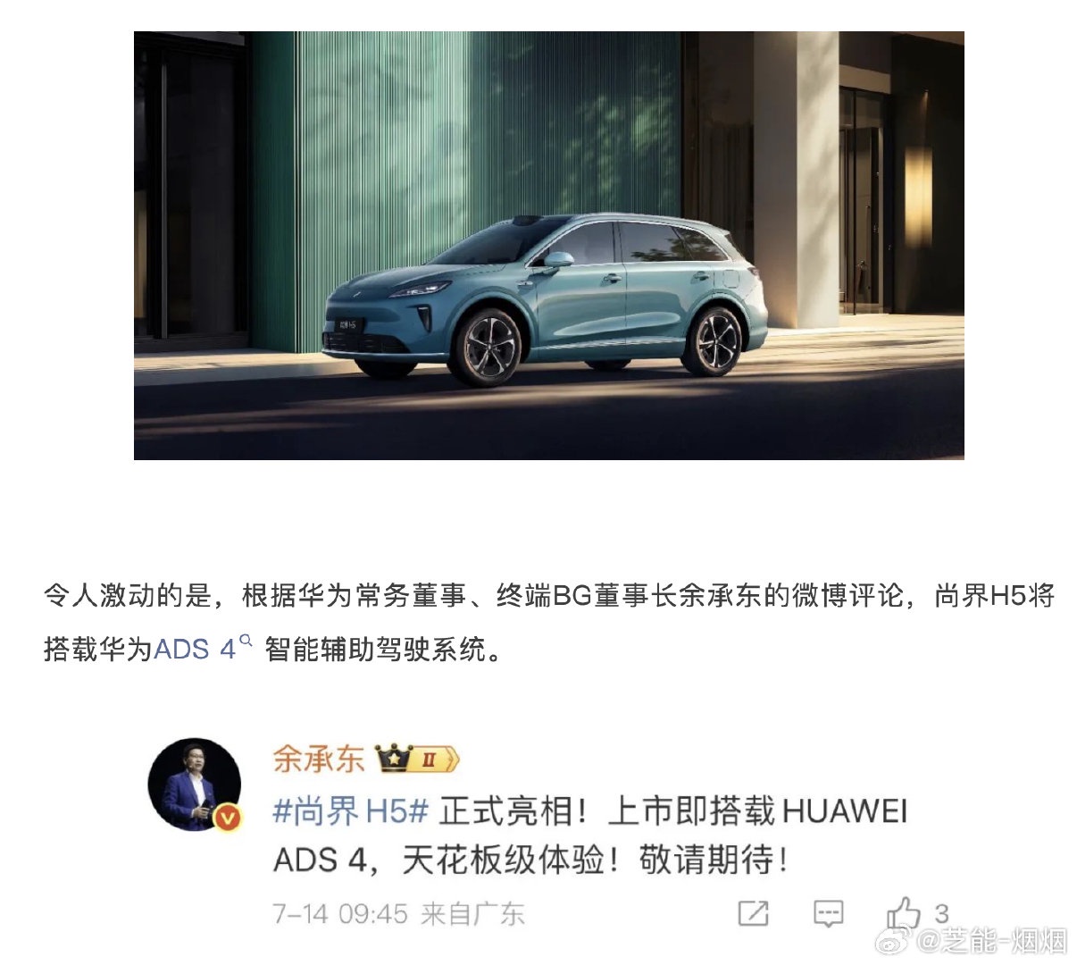 今年下半年最值得期待的智能電動車,來了!尚界 H5,不僅是尚界品牌的首款量產車型,更是首個直接 “生而搭載” 華為 ADS 4 智能駕駛系統的 20 萬元級 SUV。這套系統目前只有百萬元級的尊界 S800 用得起,問界和智界系列都得靠 OTA 慢慢升級。