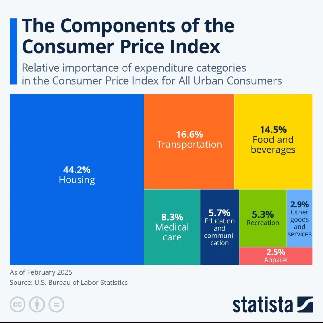 消費者支出中,各類商品和服務所佔的權重比例,主要用於衡量通貨膨脹的構成結構。其中“住房” 佔比最大,是 CPI 中最關鍵的組成部分。