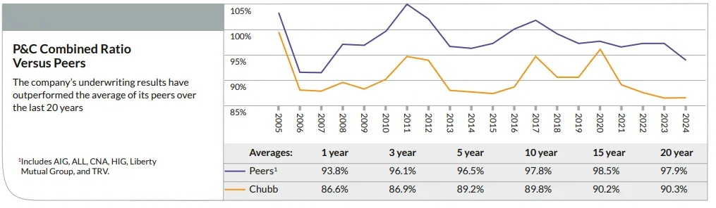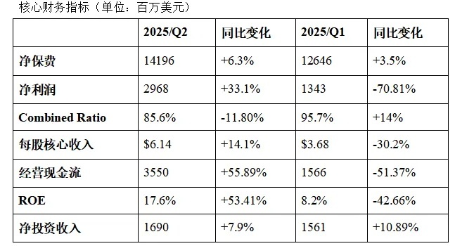 2025/2Q 實現淨收入 29.7 億美元,增長 33.1%,核心營業收入達到創紀錄的 24.8 億美元,增長 12.9%。每股收益 6.14 美元,同比增長 14.1%,超過分析師預期的 5.84 美元。本季度綜合成本率(combined ratio)為 85.6%,略高於分析師預計的 85.2%,且優於去年同期的 86.8%,反映出承保利潤率走強。