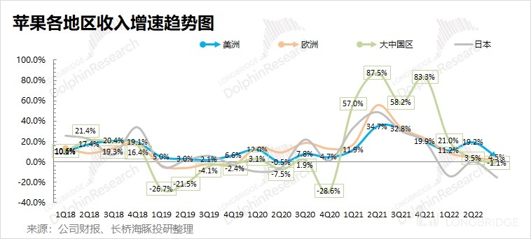 從各地區來看:蘋果全球各主要地區收入增速都有明顯下滑,這主要受整體經濟低迷影響。其中大中國區在疫情等因素影響下,收入端下滑 1.1%,而日本地區收入 15.7% 的下滑,另還有日元大幅貶值的因素。