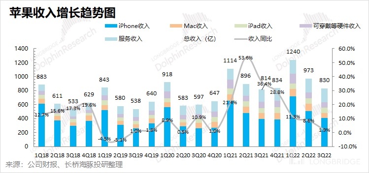 1.1 收入端:2022 財年第三季度蘋果公司實現營收 830 億美元,同比增長 1.9%,符合彭博一致預期(827 億美元)。蘋果公司本季度的收入增長主要來源於 iPhone 業務和軟件服務,而除 iPhone 以外的其餘硬件產品均出現不同幅度的下滑。