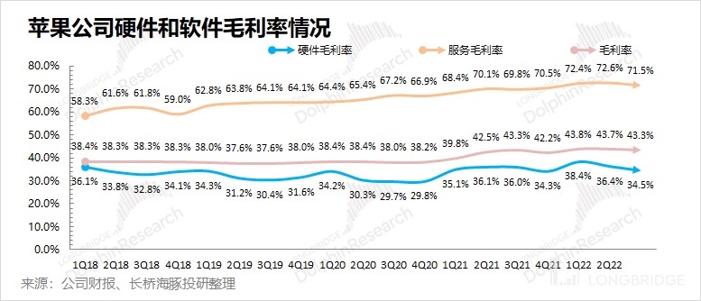 蘋果公司本季度軟件毛利率略有回落,仍站穩 70% 以上的水位。而市場最關注的仍是硬件端的毛利率水平,本季度蘋果硬件毛利率下滑較為明顯,下滑至 34.5%。受疫情、通脹等因素影響,蘋果硬件端在本季度繼續承受成本壓力。