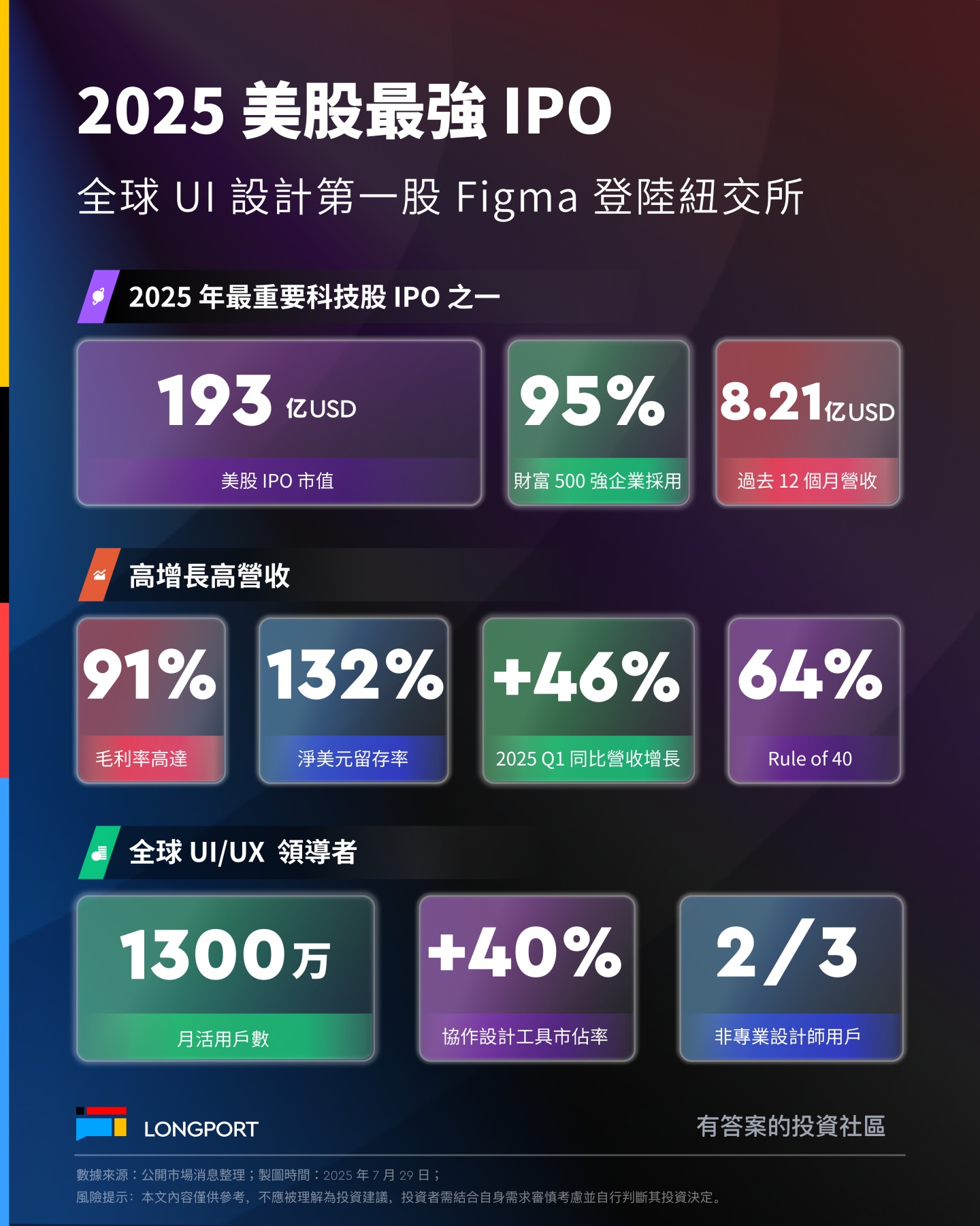 看看 Figma 最近的財務成績單,表現強勁。 2025 年第一季度營收 2.28 億美元,同比增長 46% ,全年收入有望突破 10 億美元大關。91% 的毛利率接近軟件業頂尖水平,132% 的淨美元留存率反映客戶黏性強,Rule of 40 得分 64% ( 46% 增長率 + 18% 營業利潤率) 位居行業前 5%,跑贏行業 95% 的對手。2025 年 Q1 淨利潤 4490 萬美元,自由現金流 9460 萬美元 (同比增長 95% )。公司展現出強勁的盈利能力。