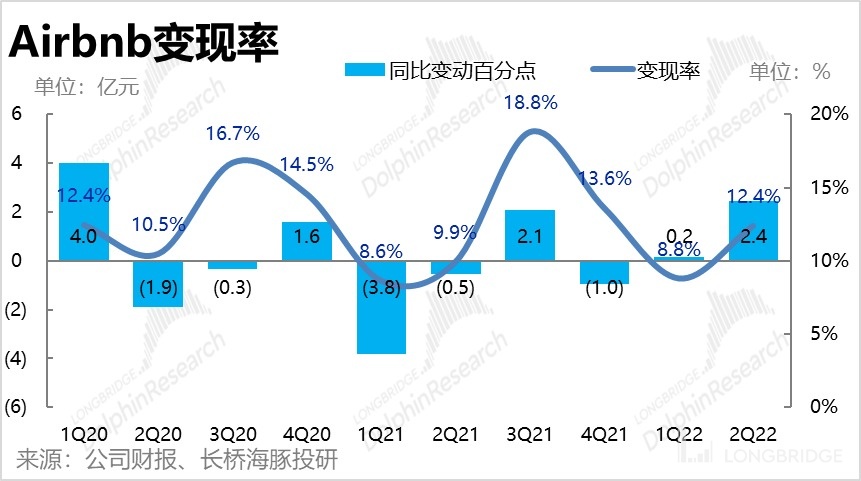 2. 變現率穩步提升,營收繼續高增:公司本季實現收入 21.04 億元,略高於市場預期的 20.95 億元。雖然總訂單金額 (GBV) 同比增速放緩,但由於變現率同比增長 2.4pct 到 12.4%,公司營收增速仍達 58%。公司作為唯一的 C2C 民宿出租平台,其變現潛力相較傳統 2B 的 OTA 平台會明顯更高。隨着公司不斷推出新服務,本季仍在穩步增長的變現率是除 GBV 外,Airbnb 業績增長的另一核心驅動因素。