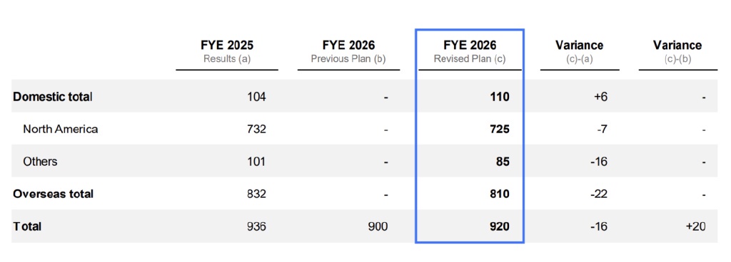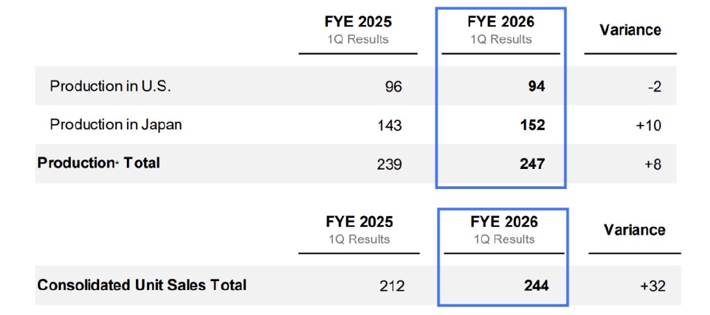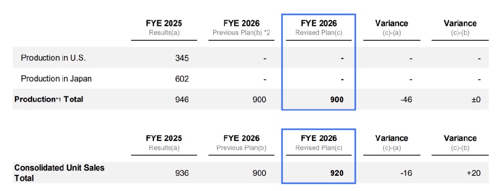 ◎ 2026 財年總產量為 90 萬輛,合併銷量 92 萬輛,較上年減少 16,000 輛。