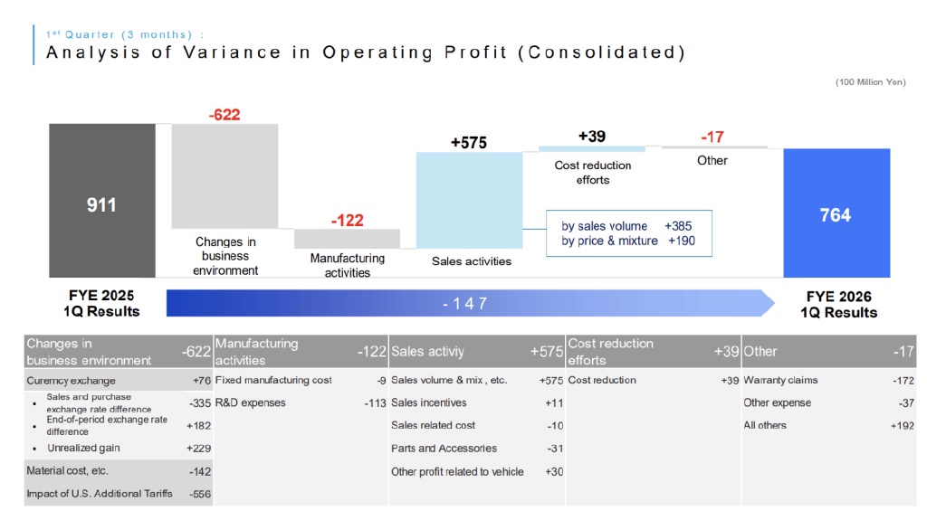 反差主要來自美國加徵關税的衝擊,從季度中期開始對利潤形成直接壓力,單項影響達到 556 億日元。