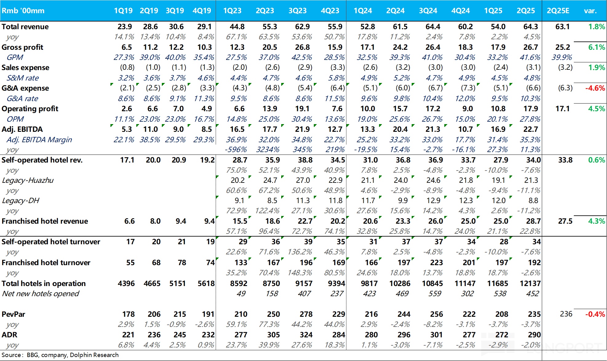 A:我們一直堅持 “高質量增長” 戰略,而不是單純追求規模擴張,因此會對新簽約的物業和選址更加嚴格,以確保加盟商能盈利、產品質量過關。在利潤率方面,受益於輕資產貢獻提升、供應鏈降本、CRS 直銷佔比增加,以及部分租金減免,集團在 RevPAR 下降的情況下仍實現了調整後 EBITDA 同比 +11.3%。剔除股份支付費用,二季度 SG&A 同比下降約 1%。未來我們仍會有部分投資,但必須考慮合理的 ROI。從長期來看,隨着輕資產貢獻度進一步提高,利潤率有望保持穩定或逐步改善。