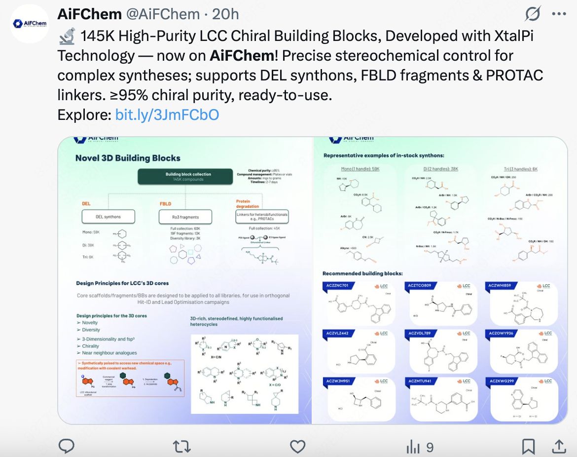 2025社區人氣作者$晶泰控股(02228.HK)自收購英國 Liverpool ChiroChem(LLC)科技公司後,AiFChem(晶泰在馬薩諸塞州的子公司)上線了基於該技術聯合開發的高純度手性構建塊系列,涵蓋 45,000+ 個化合物,純度≥ 95%。