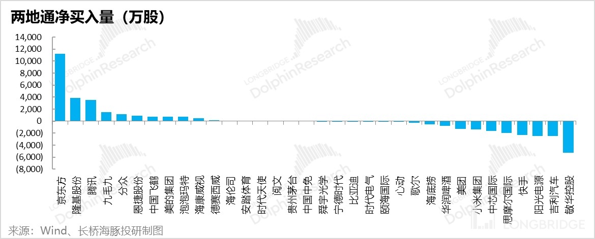 上週在海豚君關注股票的資金流向上:北上資金最大量買入的標的是面板龍頭京東方(海豚君近期發佈了一篇京東方的深度報告,認為其行業拐點即將到來,具體請見長橋 App 中海豚的報告)。此外,新能源中的隆基股份和恩捷也還在被資金持續買入。股價持續在低位徘徊的騰訊和分眾,也是資金重點買入的標的。