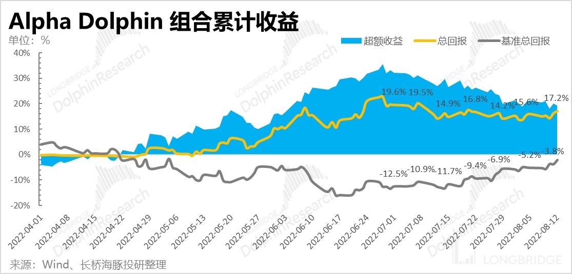 如果以 3 月 1 日內部測試啓動時點來看,海豚 Alpha Dolphin 組合截至上週五的整體收益接近 18%(含股息收益),股票資產收益接近 20%。