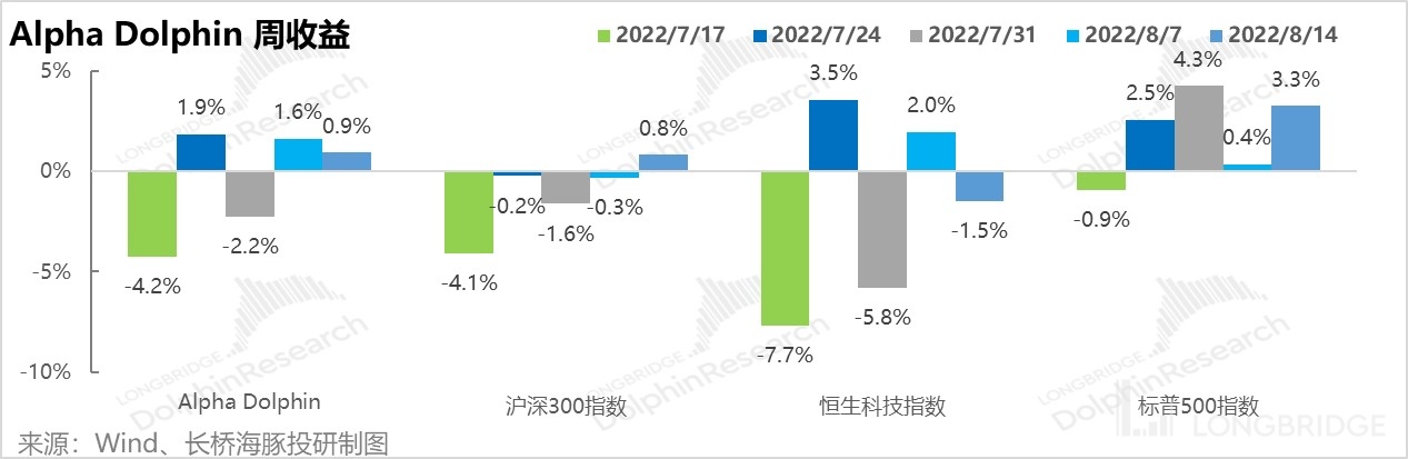 雖然美股表現強勢,但由於海豚組合中佔據半壁江山的中概資產表現並不理想,上週(8/8-8/14)海豚投研 Alpha Dolphin 組合雖實現了 0.9% 的正收益,但還是跑輸標普 500 指數大漲 3.3% 的表現,不過與滬深 300 0.8% 的漲幅相當。