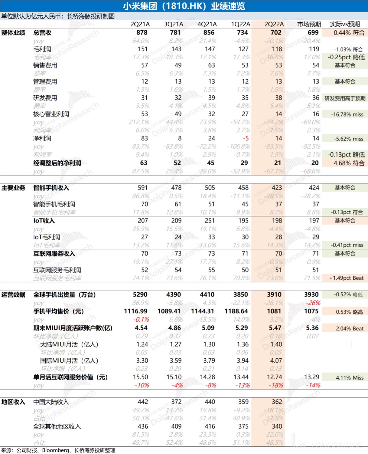2022 年第二季度經調整後的淨利潤 21 億元,符合市場預期 20 億元,小米本季財報各項指標,都基本符合市場預期。