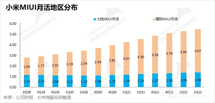 由於小米集團圍繞 “硬件 + 軟件” 模式的經營理念,雖然海外手機出貨量同比出現下降,而軟件端的海外用户數仍保持增長的態勢(新增的購買量大於更換的量)。從 MIUI 用户的分佈來看,小米至本季度末已經擁有 5.47 億的 MIUI 用户,其中有 4 億多來自於海外市場。換句話説,雖然小米公司來自於中國大陸,但是現在海外用户接近佔到公司 3/4。