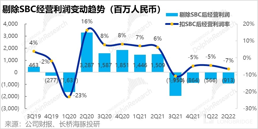 因此,雖然毛利率提升了 2pct,但費用率大幅提升後,經營利潤率還是環比由-7.3% 惡化到-11%。經營虧損也由 9.2 億擴大到 15.2 億。即便剔除了股權費用,經營虧損也由 5.7 億擴大到了 9.1 億。