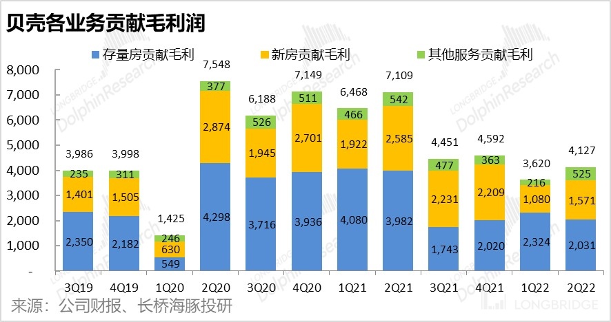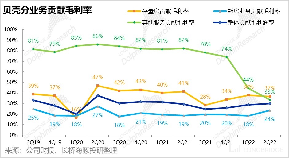 而存量房業務和其他業務的貢獻毛利則是環比持平或有所下降。不過其他業務貢獻利潤率下降的主要原因是裝修業務佔比提升,據披露本季裝修業務剔除材料和人工成本後的貢獻毛利率為 29%。剔除家裝外的其他業務貢獻毛利率則在 41% 左右。