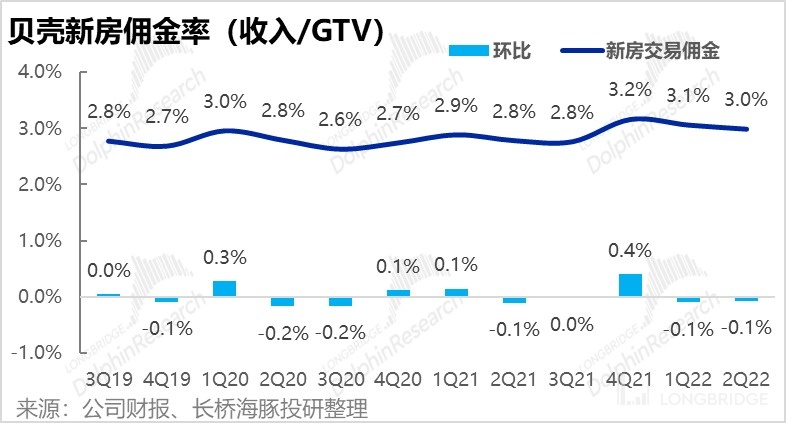 此外,和海豚君估計的一樣,由於:①結構上,貝殼的合作對象變為大型房企集中後,議價能力降低;②整體上,樓盤交易過冷後,房企支付渠道費用的能力和動機反而下降,因此新房業務的佣金率邊持續下降,本季變現率再度環比下降 10bps 到 3%。