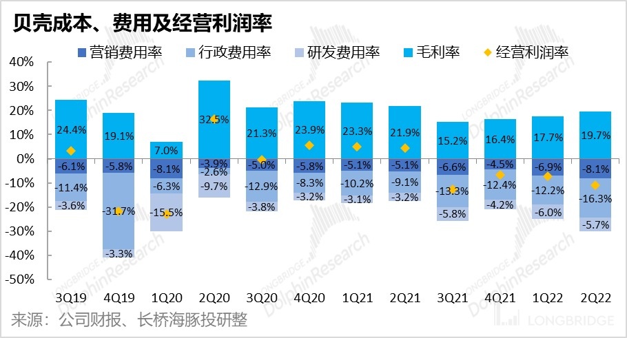 雖然營收和毛利表現都不錯,貝殼本季控費表現不好。三費中只有彈性最大的營銷費用同比減少了 10%,但相比營收下降 40% 以上,控費表現並不好。