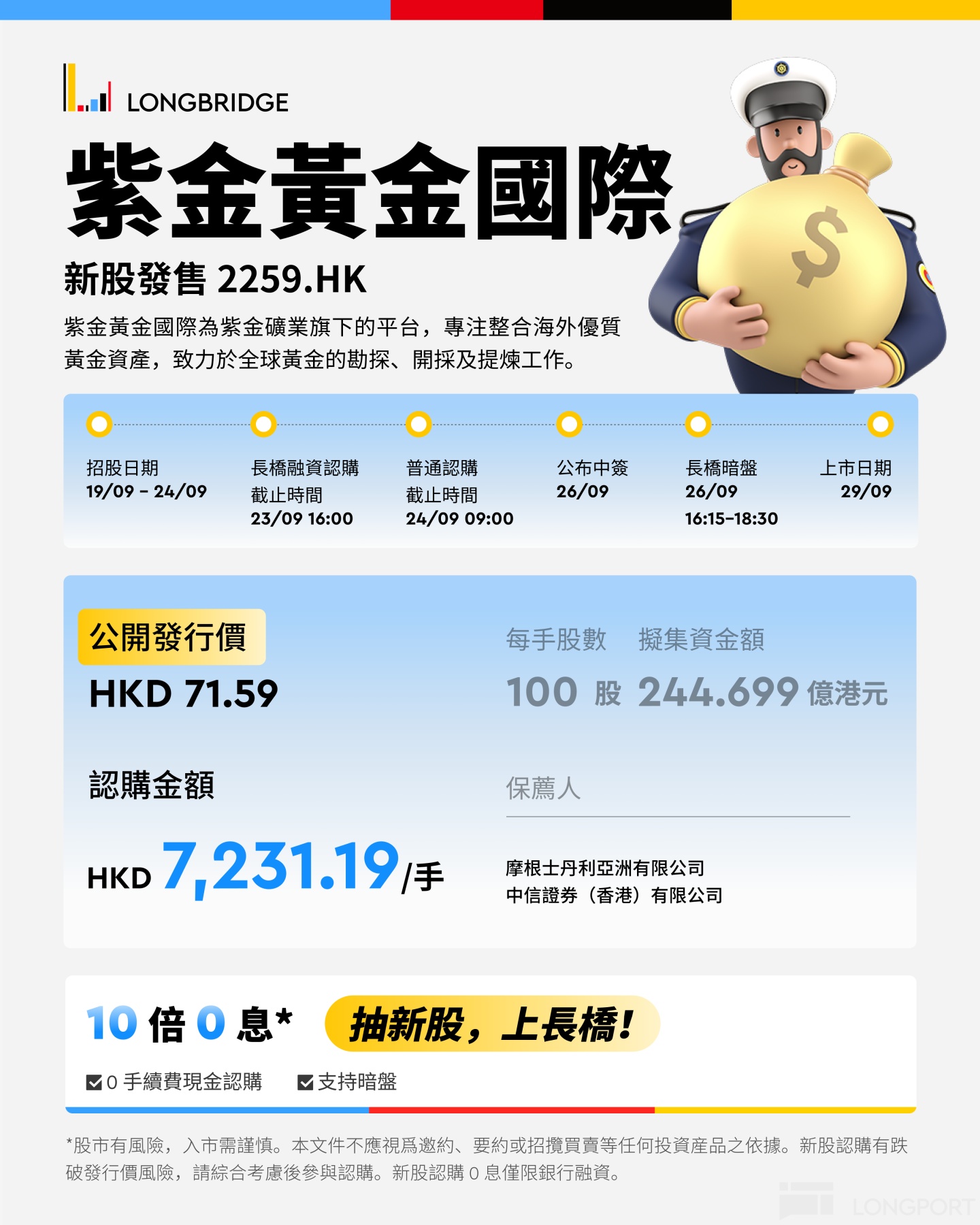 9 月 19 日,紫金礦業旗下子公司$紫金黃金國際(02259.HK) 正式啓動香港公開發售。本次 IPO 發行價定為每股 71.59 港元,預計募資總額 249.84 億港元,為年內港股第二大 IPO,僅次於寧德時代 410 億港元的募資規模。