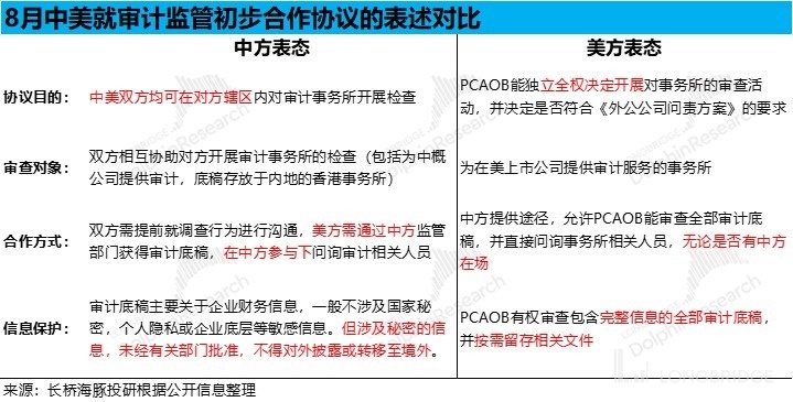 面對中概退市的危局,近期 8 月 26 日雙方突然宣佈簽訂了審計監管合作的初步協議,着實讓市場為之一振。協議的簽署表明雙方願意溝通解決爭端,讓市場對中概退市的擔憂略有減輕。但從雙方之後發表的聲明來看,兩國雙方間的核心爭議上並未取得共識,雙方的分歧具體來看: