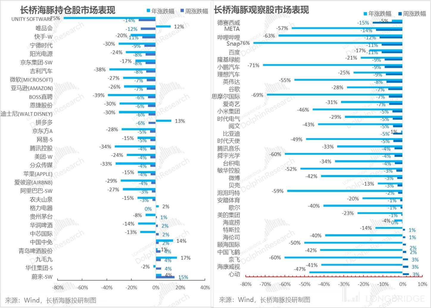 而無論是在海豚君組合中持股的公司,還是觀察倉的公司,在上週整體殺估值的環境中,跌幅大的公司要麼高估值、要麼沒信仰。