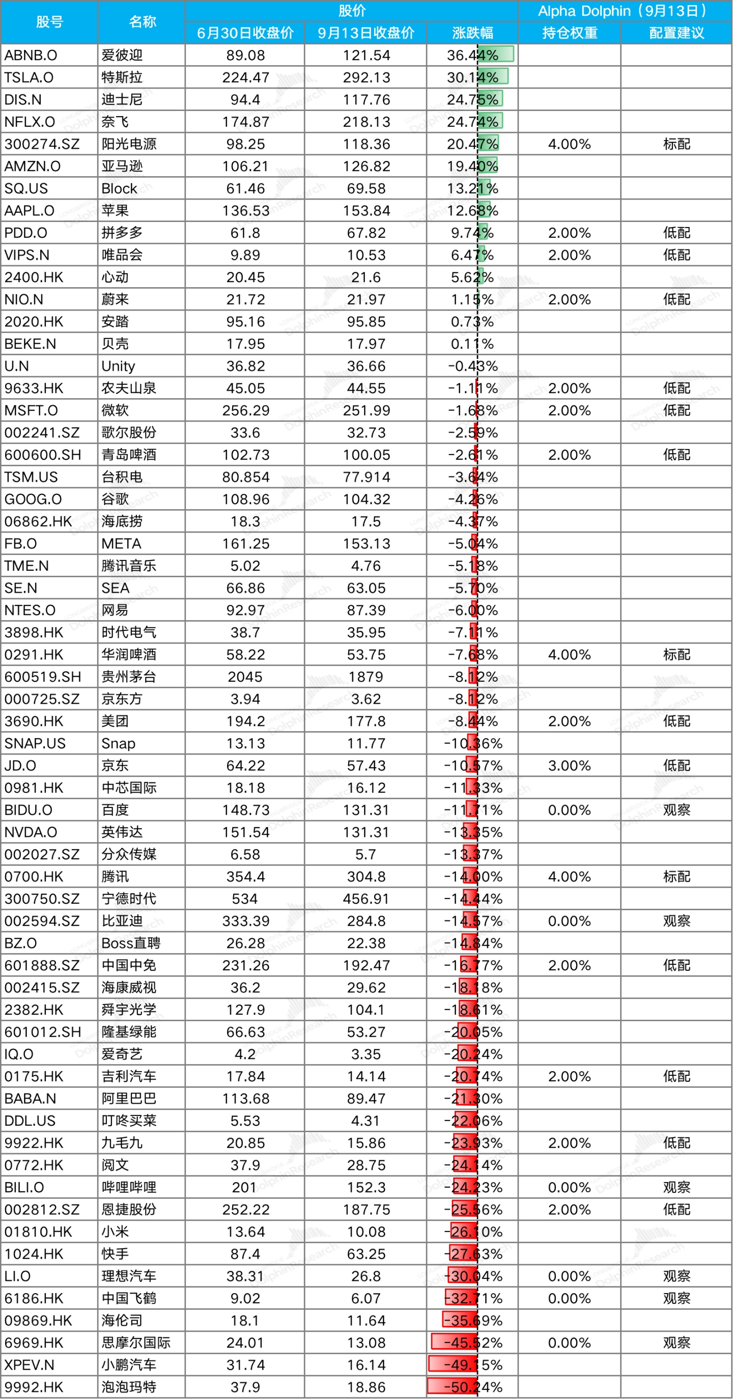 2022 年 Q2 財報季至上週基本落下帷幕,海豚君回顧本輪財報季,共計研究覆蓋了 61 家公司,以 6 月 30 日至 9 月 13 日為週期,從股價上來看,可以用 “實慘” 來形容:61 家公司中僅 14 家實現上漲,47 家最終下跌,其中 6 家公司的下跌幅度甚至超過 30%。但相比大盤指數已算不錯:恒生指數在週期內跌超 10%,滬深兩市均下跌,僅美股有所上漲。