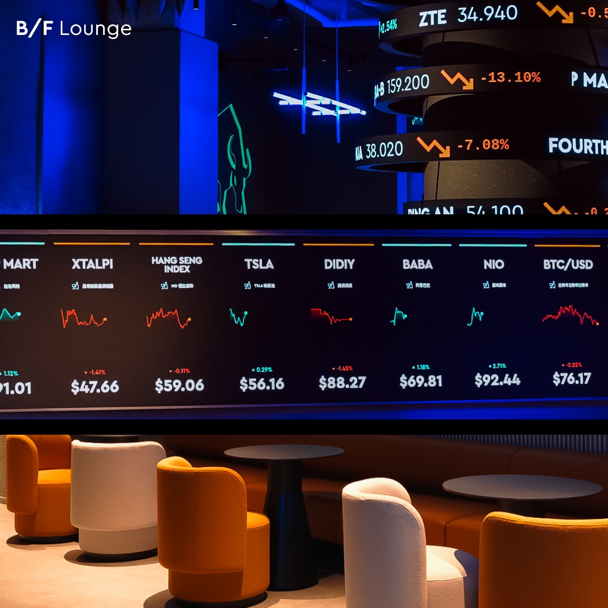 B/F:交易所主題酒吧 —— 入夜之後,此處將化身為投資者交流聚點,採用仿華爾街交易大廳設計,直播即時市場行情,並提供股票主題啤酒,最適合與朋友相聚,暢談投資心得。