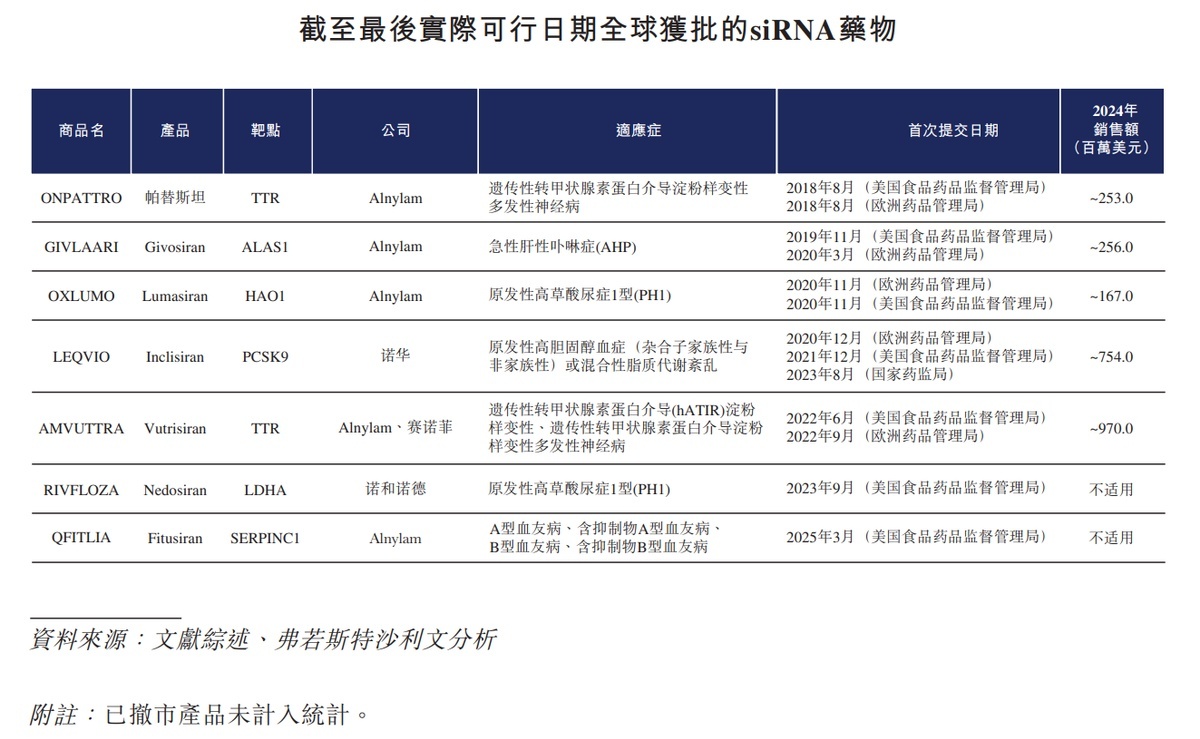 要知道,siRNA 並非十分小眾的賽道。招股書提到,自 2018 年首款 siRNA 藥物 Onpattro®(帕替斯坦)獲批以來,siRNA 療法已取得重大臨牀和商業驗證。截至最後實際可行日期,全球主要市場已有 7 款 siRNA 產品獲批上市,背後諾華、薩諾菲、Alnylam 等大廠雲集。