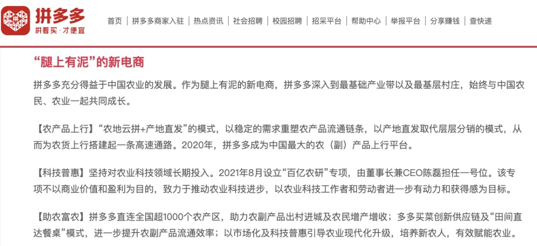 不同於其他電商平台,拼多多的品牌宣傳中,一直是諸如多多農園、農地雲拼、多多好特產的助農項目。公司官網的介紹中,也多次強調: