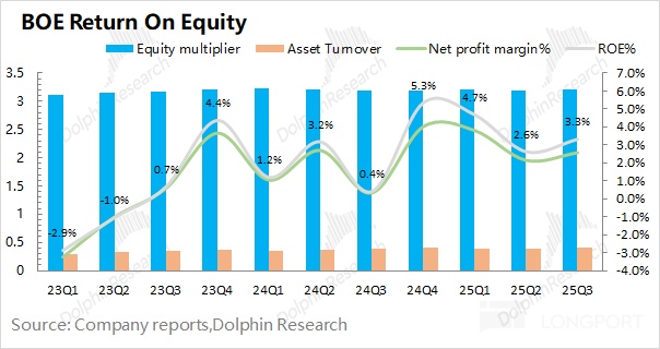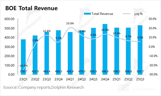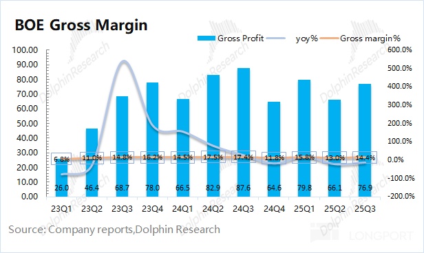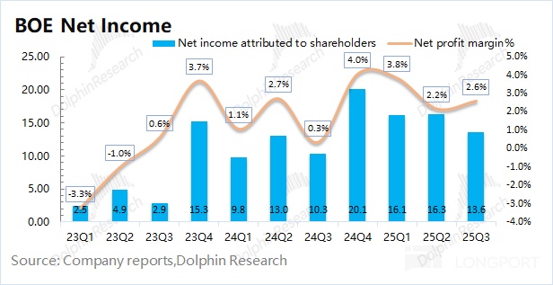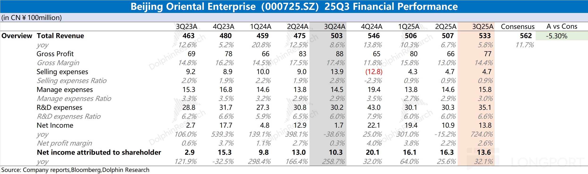 1.整體業績:京東方 2025 年第三季度實現營收 533 億元,同比增長 5.8%。此前公司收入的大幅回升,主要是受面板價格回暖的帶動。由於下游需求仍相對偏弱,價格開始趨於平穩,公司單季度收入維持在 500 億附近。京東方 2025 年第三季度歸母淨利潤為 13.6 億元,同比增長 32%,主要是受非經營性因素(營業外收入等方面)的影響。