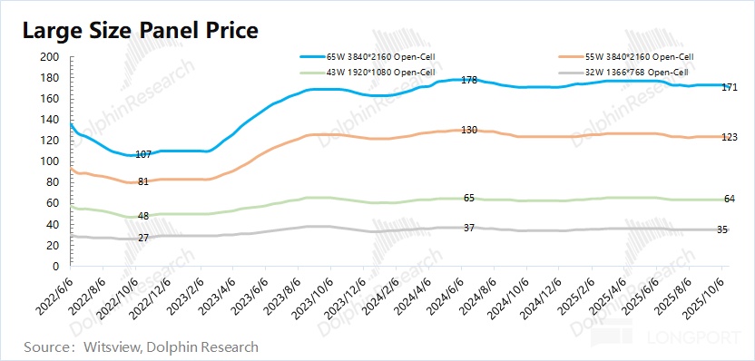 3.面板價格變化:公司的主要營收來自於電視屏幕等大面板,面板價格變動直接影響公司的業績表現。三季度大面板價格保持相對平穩,其中 65 寸/55 寸/43 寸/32 寸面板價格分別維持在 173/124/64/35 美元。由於下游市場需求相對平淡,面板價格的上漲已經按下了 “暫停鍵”。