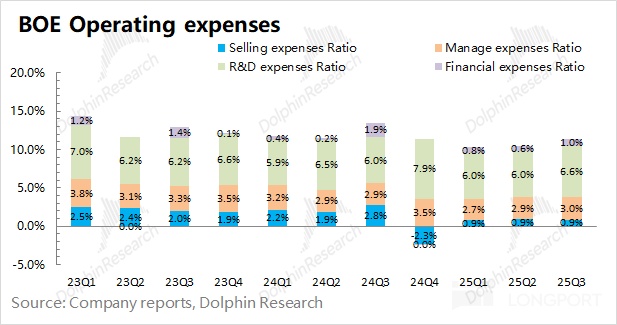2.毛利率及費用率:$京東方A(000725.SZ) 本季度毛利率為 14.4%,同比明顯下滑 3pct。其實這裏,公司從去年年末開始進行了會計政策調整(公司將計提的保證類質保費用計入 “主營業務成本”,而不再計入 “銷售費用”)。這項操作,讓銷售費用降低了,而營業成本則增加了。
