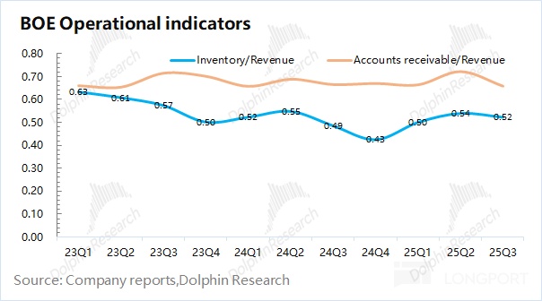 4.存貨及價格變動:京東方在 2025 年第三季度的存貨增加至 278.6 億元,環比微增 1.9%。公司本季度存貨/收入的比值維持在 0.52。當下供需情況相對平穩,未看到下游大幅拉貨的跡象。