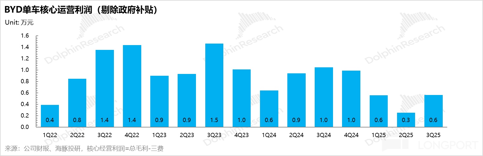 而如果看比亞迪的單車核心利潤情況(核心經營利潤=總毛利 - 三費),比亞迪的單車核心經營利潤終於也有所回升,從上季度的最低谷 0.25 萬元回升至本季度 0.57 萬元,基本與一季度持平。