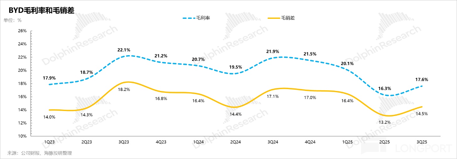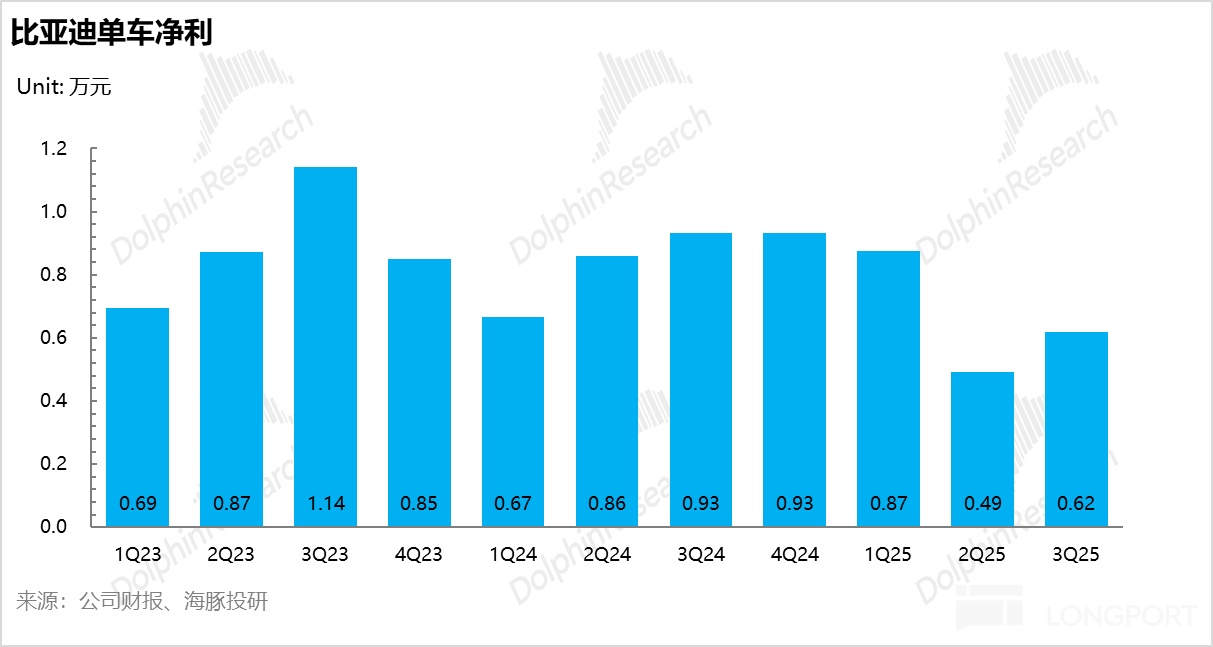 海豚君預計在四季度購置税退坡帶來的搶購效應,以及比亞迪從 9 月末開始對插混車型的升級下,預計四季度銷量會繼續環比上行 29% 至 144 萬輛,達到 2025 年全年 470 萬輛銷量預期,而賣車毛利率和單車淨利也會由於規模效應的釋放,可能還會呈現繼續邊際上行趨勢。