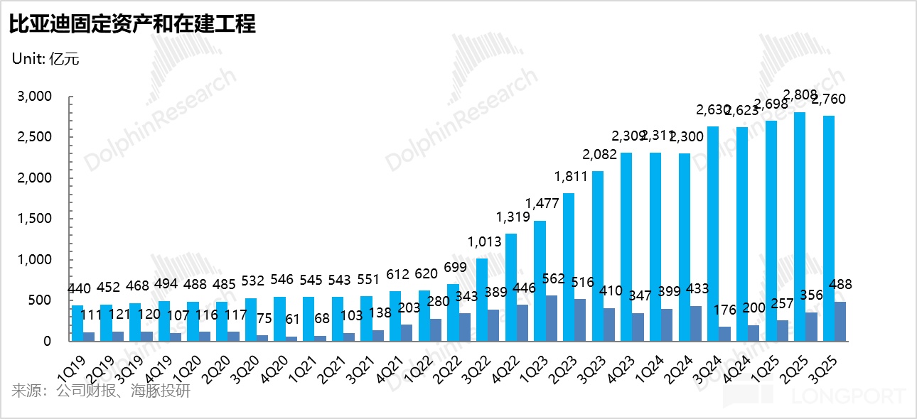 比亞迪本季度資本開支雖有下滑,但相比於 2024 年 200 多億的資本開支投入還是有明顯上行,而比亞迪在建工廠本季度也環比上行 132 億至 488 億。