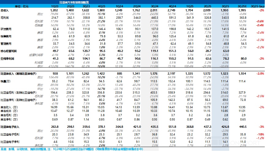 賣車收入由於賣車單價的環比下滑低於預期,而比亞迪電子收入本季度也呈現了環比下行的趨勢,最後整體收入 1950 億,略低於市場預期 1995 億,同比也下滑了 3%。