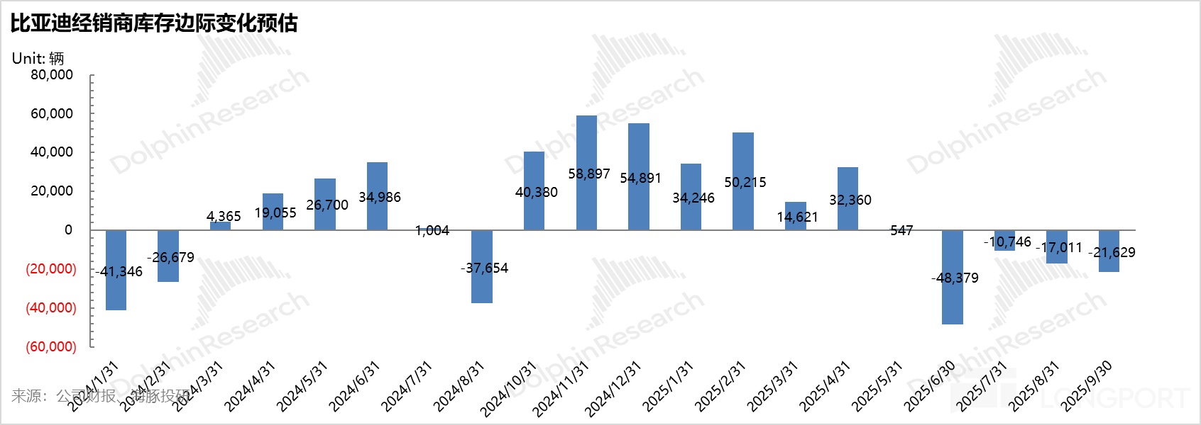 三季度由於賣車銷量已經是明牌,比亞迪因為三季度迎合 “反內卷” 政策,對二季度大額促銷折扣的部分回收,以及實施降庫存戰略,三季度的賣車銷量反而相比二季度還要環比下滑 2.7 個百分點至 114.5 萬輛。