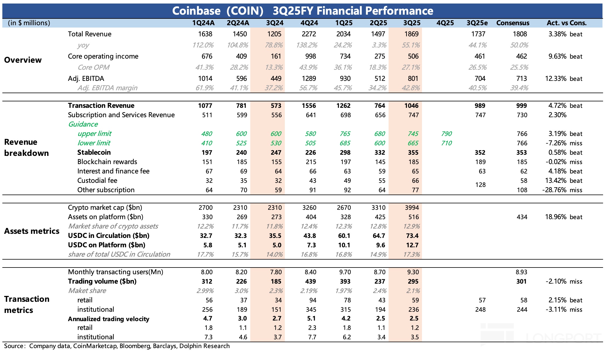 1)公司在 2025 財年第三季度實現穩健增長,Coinbase 正全面推進 “Everything Exchange” 戰略。
