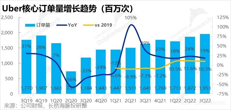 具體來看,本季度打車業務實現訂單金額 136.8 億美元,略低於市場預期中值的 138.6 億。同時,在線下經濟復甦引領的 4-5 個季度的快速復甦(同比增速持續高於 50%)後, 本季度增速放緩到 38.5%。而從相比 2019 年同期的增速來看,本季也是 2020 年二季度以來首次復甦情況開始掉頭向下。