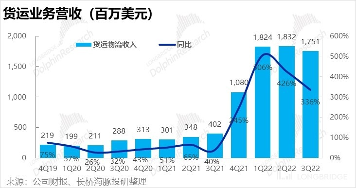 在打車和外賣這兩項核心業務外,Uber 的貨運業務本季度實現了營收 17.5 億元,雖看似同比暴增 336%,但實際相對市場預期低了 7%。並且規模暴漲主要是由於並表了物流公司 Transplace 的影響。剔除並表影響,物流業務的實際增速實際較低。公司管理層也表示在後疫情時代,貨運物流需求實際已開始轉若。這點從公司貨運收入環比明顯下降也可看出一二。