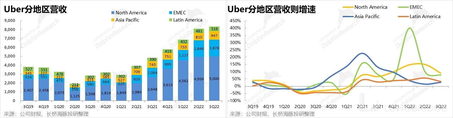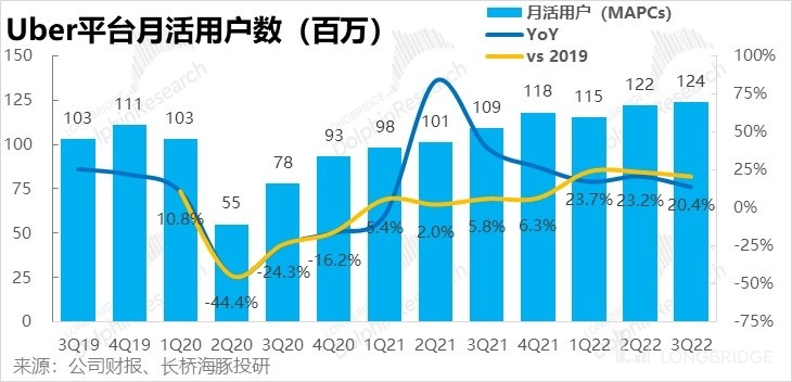 如上文提及,由於 Uber 在英國地區的業務從平台模式轉變為自營模式。公司確認的營收從淨佣金改變為總付款金額,導致營收被有所放大,因此下文海豚君主要從剔除會計變更影響後的表現。
